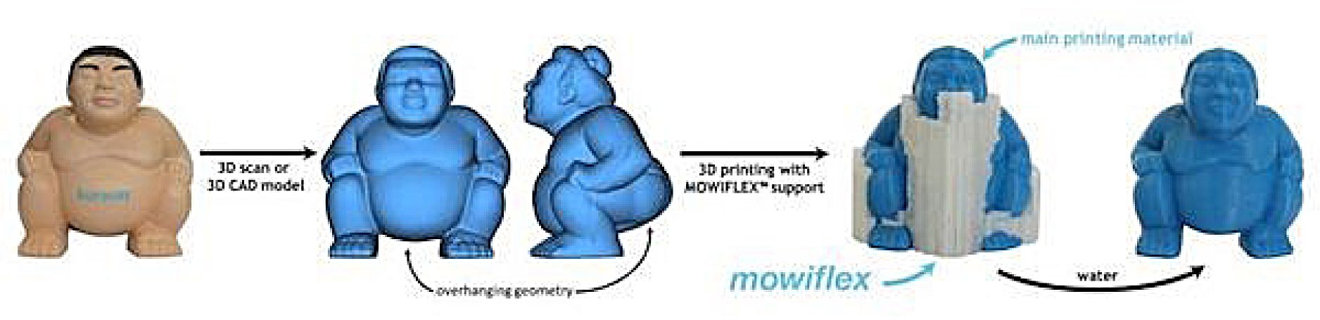 Comercializado bajo la marca Mowiflex, el material cuenta con una excelente adhesión a otras resinas como el ácido poliláctico (PLA), poliamida (PA), polivinil butiral (PVB) y poliuretano termoplástico (TPU). Por lo tanto, el filamento Mowiflex se puede utilizar como material de soporte para productos impresos en 3D que incorporan cortes, piezas móviles y otras formas complejas. Mowiflex es soluble en agua fría.